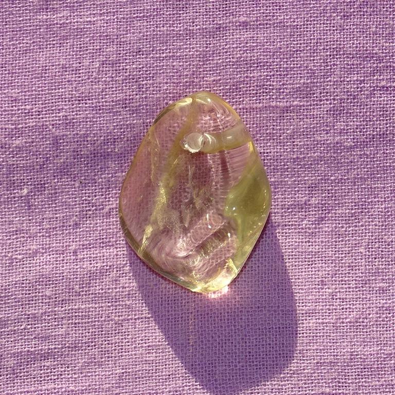 Der Heliodor ist gelblich durchsichtig, der violette Schimmer kommt nur von der Unterlage!